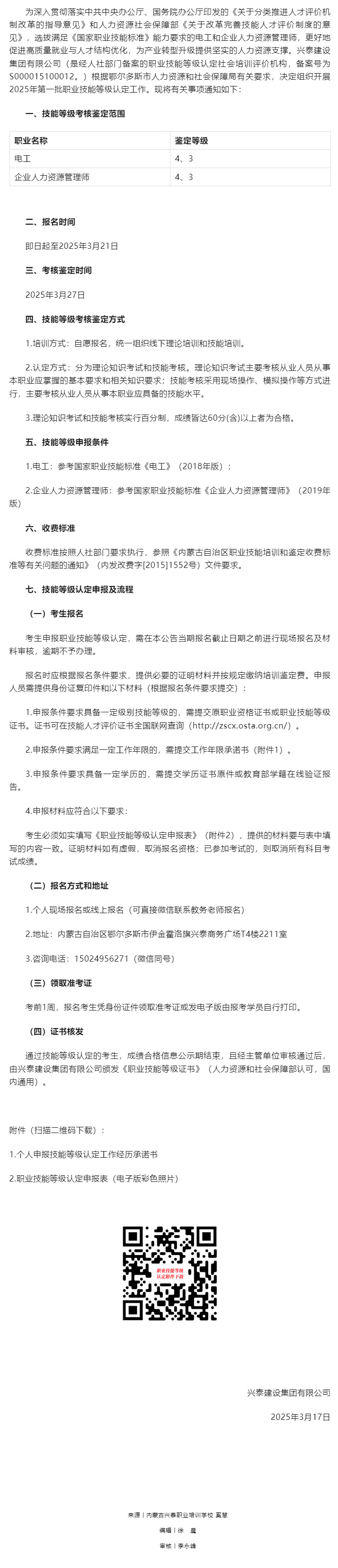 興泰建設集團有限公司2025年第一批職業技能等級認定公告